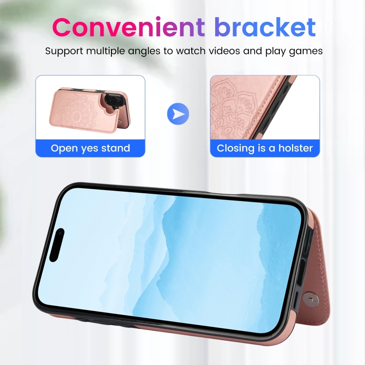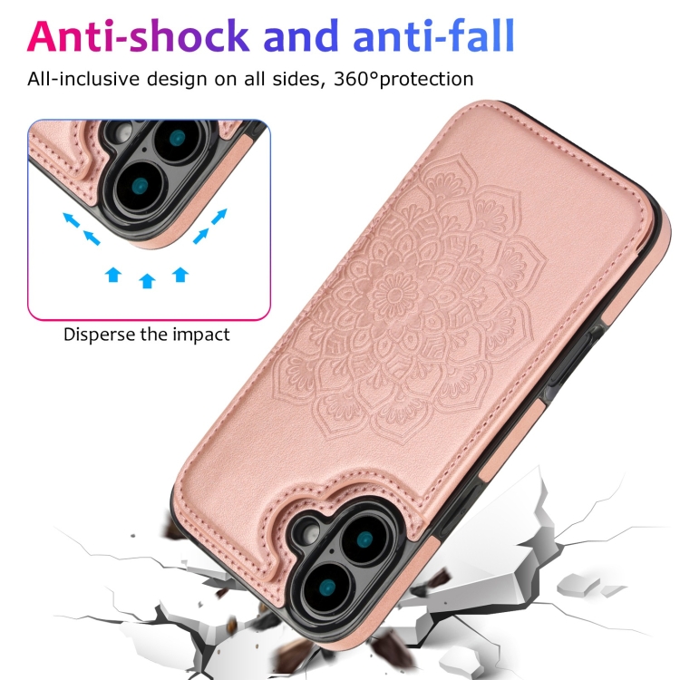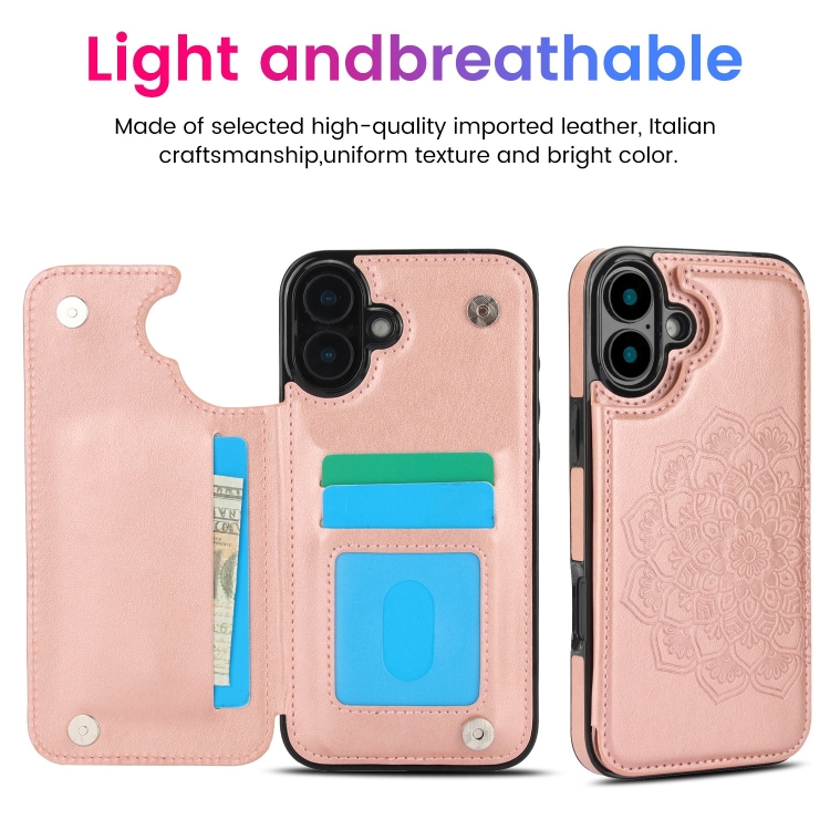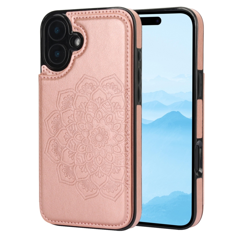 Funda para Teléfono Cuero iPhone 16 Plus Billetera Doble Hebilla Mandala (Oro Rosa)