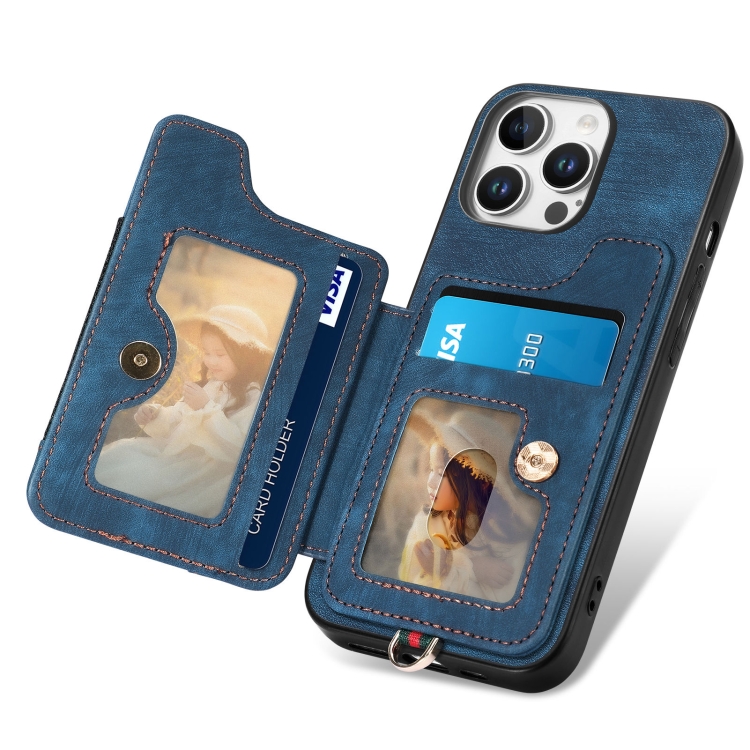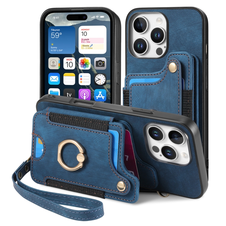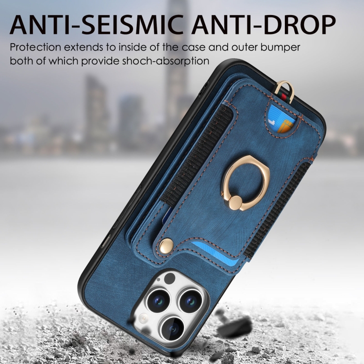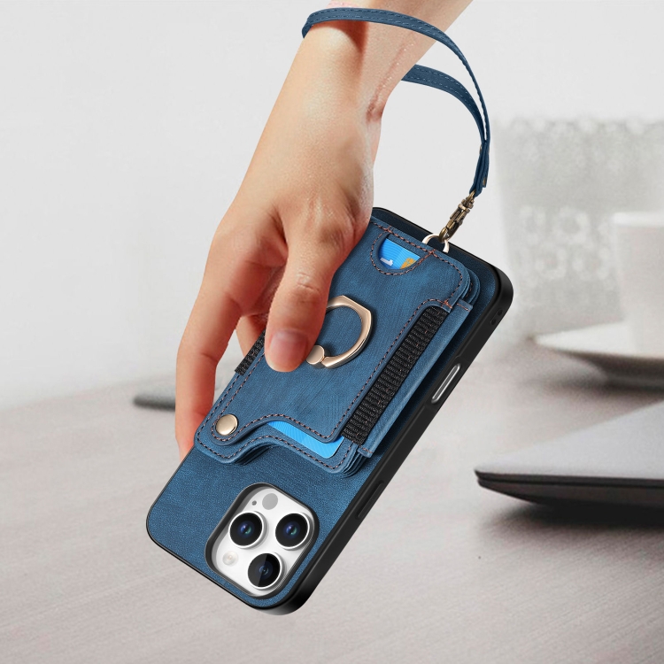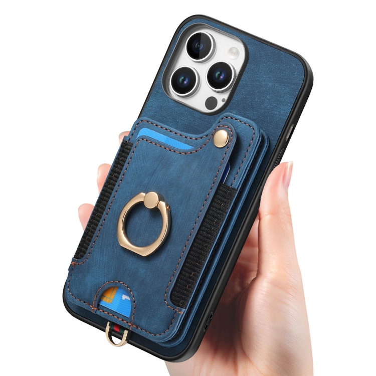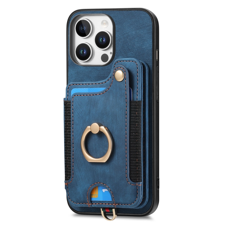 Funda para Teléfono iPhone 16 Pro con Billetera MultiTarjeta Diseño Retro Piel Sintética Anillo (Azul)