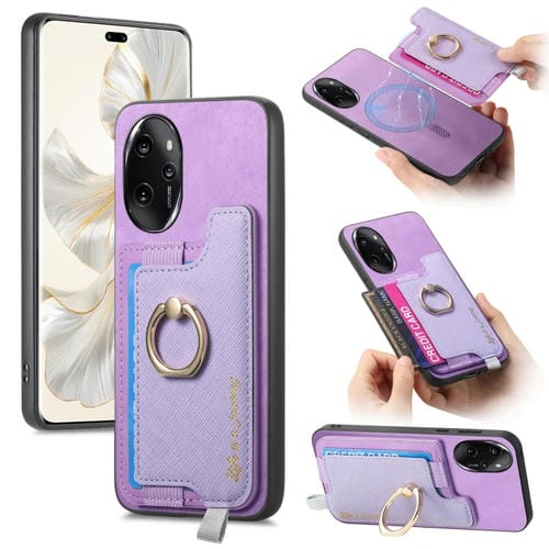 Funda para Teléfono Honor 100 Pro con Tarjetero y Anillo de Cuero Diseño Retro Magsafe (Morado)