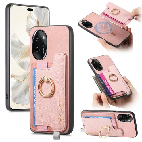 Funda para Teléfono Honor 100 Pro con Tarjetero y Anillo de Cuero Retro Magsafe (Rosa)