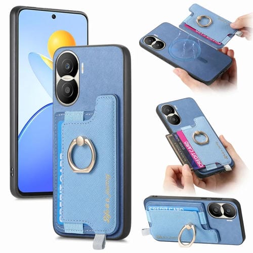 Funda Teléfono Cuero con Tarjetero y Anillo Retro Magsafe Cross para Honor Play 7T/X7A (Azul)