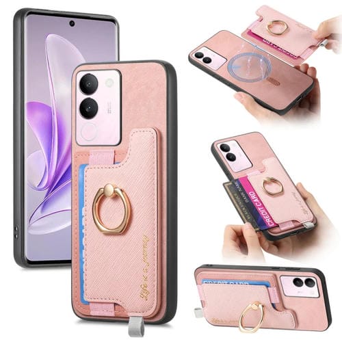 Funda para Teléfono con TaRJetero y Anillo de Cuero con Diseño Retro Magsafe para Vivo S17/S17 Pro/V29 Pro 5G (Rosa)