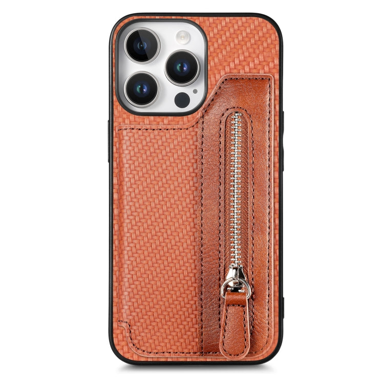 Funda Tipo Billetera con Cremallera y Tapa Horizontal de Fibra de Carbono para iPhone 16 Pro Max (Marrón)