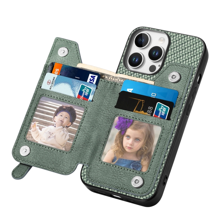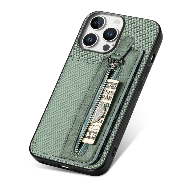 Funda Tipo Billetera con Cremallera y Tapa Horizontal de Fibra de Carbono para iPhone 16 Pro (Verde)