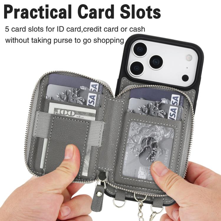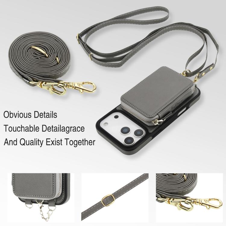 Funda tipo cartera bandolera con cremallera AwQuer 2 en 1 para iPhone 17 Pro Max con parte trasera de cuero (Gris)