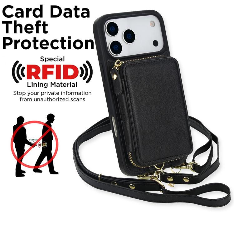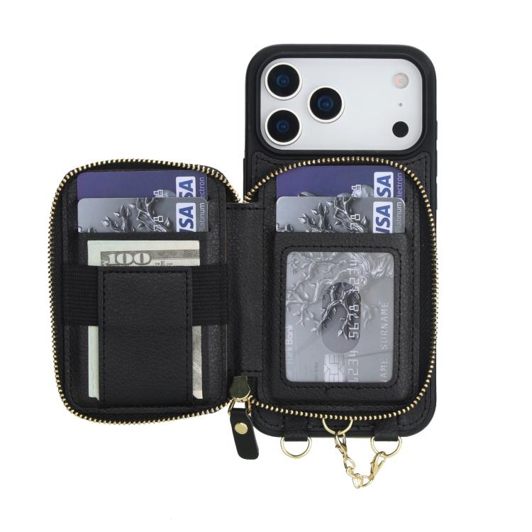 Funda tipo cartera bandolera con cremallera AwQuer 2 en 1 para iPhone 17 Pro Max con parte trasera de cuero (negra)