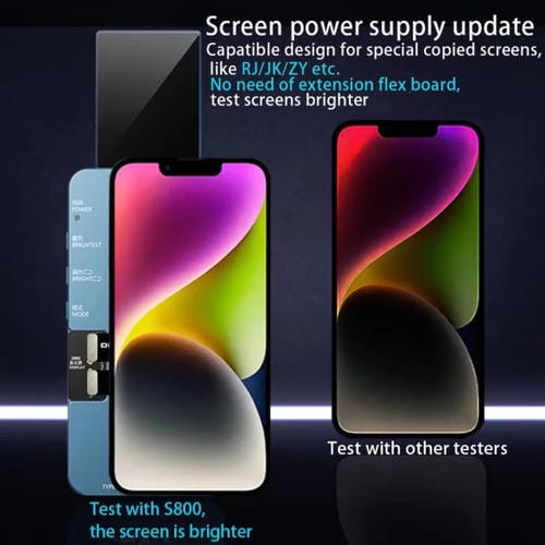- Capacidad de transporte de corriente de 6A, Pantalla Táctil de 2,8 pulgadas, capacidad de bits de 64G, actualización remota del software, diseño de Placa pequeña desmontable con función de protección, Pruebas de voltaje, corriente, Reparación de Face ID y recuperación de TrueTone