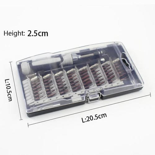 • Contiene 60 Piezas con puntas Phillips, hexagonales, cruzadas, de estrella, en forma de U, Y, triangular, cuadrilátero, zócalos y destornillador anti-cruz; dureza HRC58-62; tamaño aproximado del set 20,5 x 10,5 x 2,5 cm; peso aproximado 365 gramos; mango con almacenamiento interno y diseño antideslizante