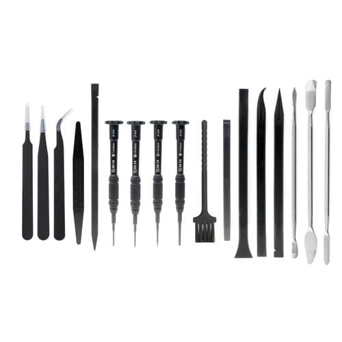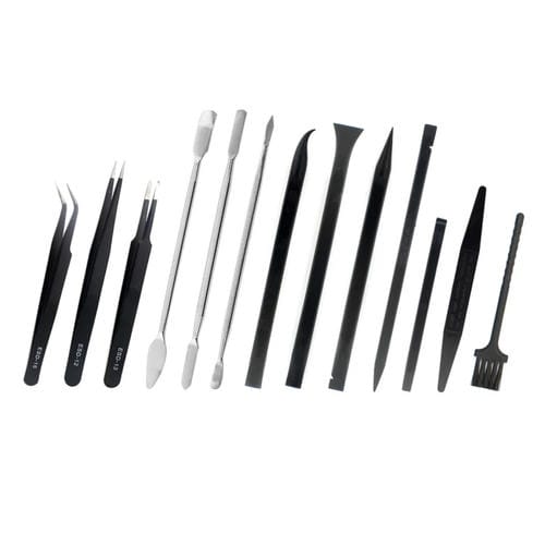- Incluye 17 herramientas: pinzas (x3), palo capacitivo, palo puntiagudo, cepillo, spudgers (x4), espátula de Metal, destornilladores Torx 0.8, cruzado 1.5, de tres puntos 0.6 y de zócalo 2.5 mm