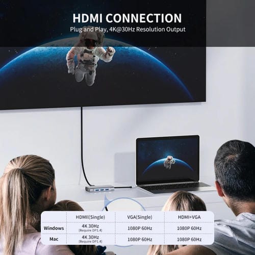 - Incluye 1 Puerto Ethernet RJ-45 de 1000 Mbps, 1 Puerto de Carga PD Tipo-C con Soporte hasta 87 W, 3 Puertos USB 3.0 con velocidad de transferencia hasta 5 Gbps, 1 salida HDMI 4K UHD y 1 salida VGA con resolución máxima de 1080P cuando se utilizan simultáneamente