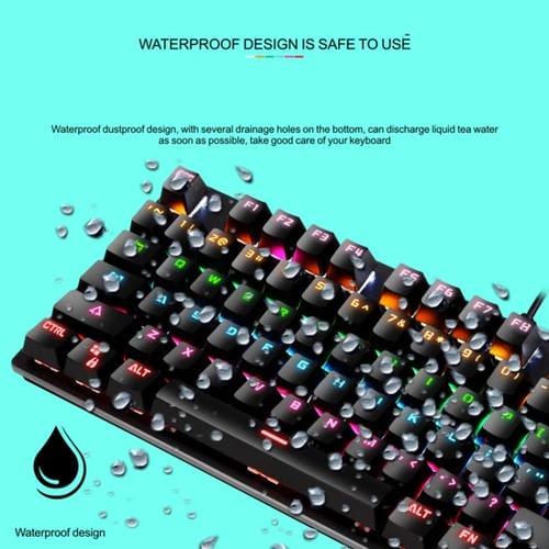 • 87 teclas con arquitectura X, eje mecánico verde, vida útil de Botón de hasta 10 millones de pulsaciones, voltaje de funcionamiento de 250 mA, Cable de 1,8 metros con bucle magnético, diseño de teclas de altura alta y baja, múltiples efectos de iluminación