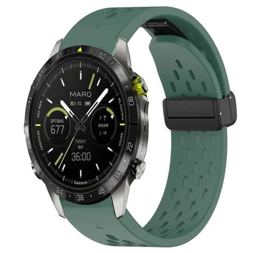 Para Garmin Marq Orificios de Liberación Rápida Correa de Reloj de Silicona con Hebilla Magnética (Verde Oscuro)