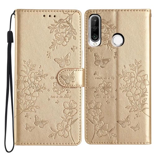 Funda para Huawei P30 Lite de Cuero con Relieve Flor y Mariposa (Dorado)