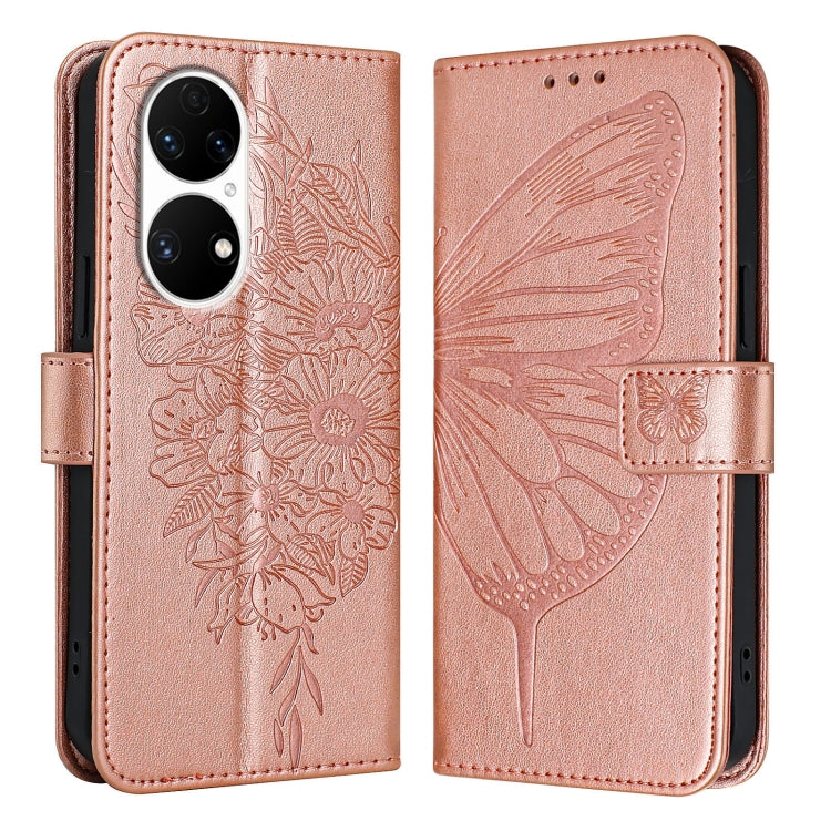 Funda de Cuero para Huawei P50 con Mariposa en Relieve (Oro Rosa)