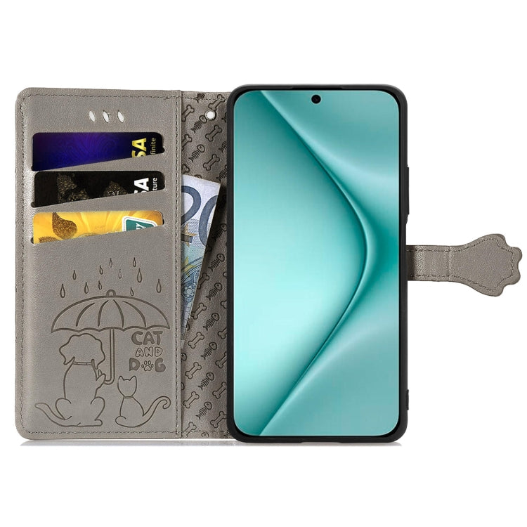 Funda para Huawei Pura 70 de Cuero con Relieve de Perro y Gato (Gris)