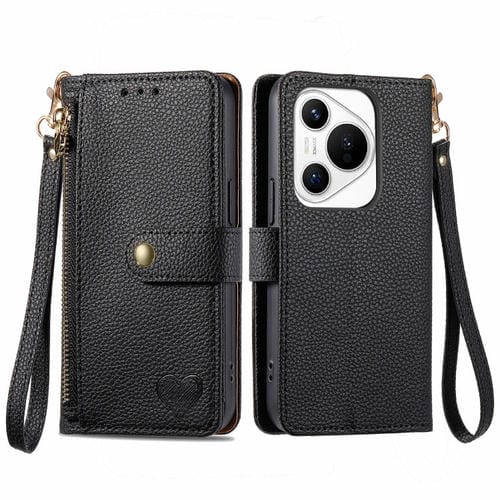 - 1x Funda de Cuero para Huawei Pura 70 Love Zipper Lanyard (Negro)