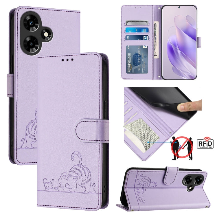 Estuche para Infinix Hot 30 4G de Cuero RFID con Patrón en Relieve y Cordón (Púrpura)