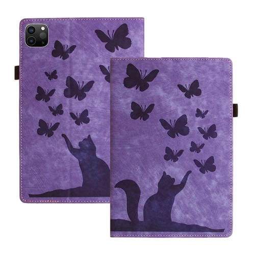Funda para iPad Pro 11 (2024) de Piel con Estampado de Mariposa y Gato (Morado)