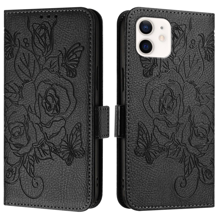 Estuche para Teléfono iPhone 11 Cuero Antirrobo Rfid con Rosa en Relieve (Negro)