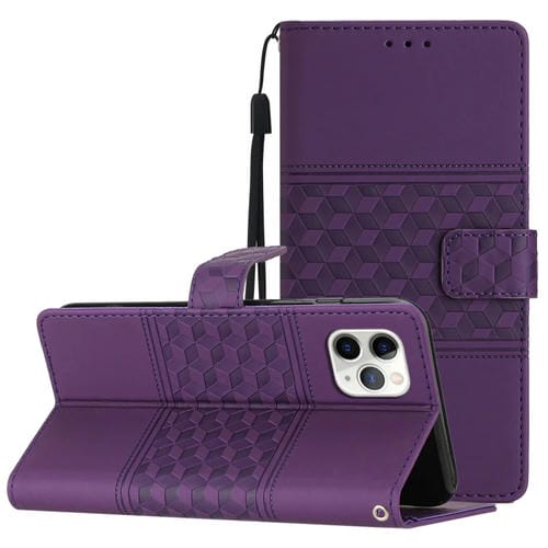 Funda de cuero para iPhone 11 Pro Diamond Embossed Skin Feel con cordón (Púrpura)