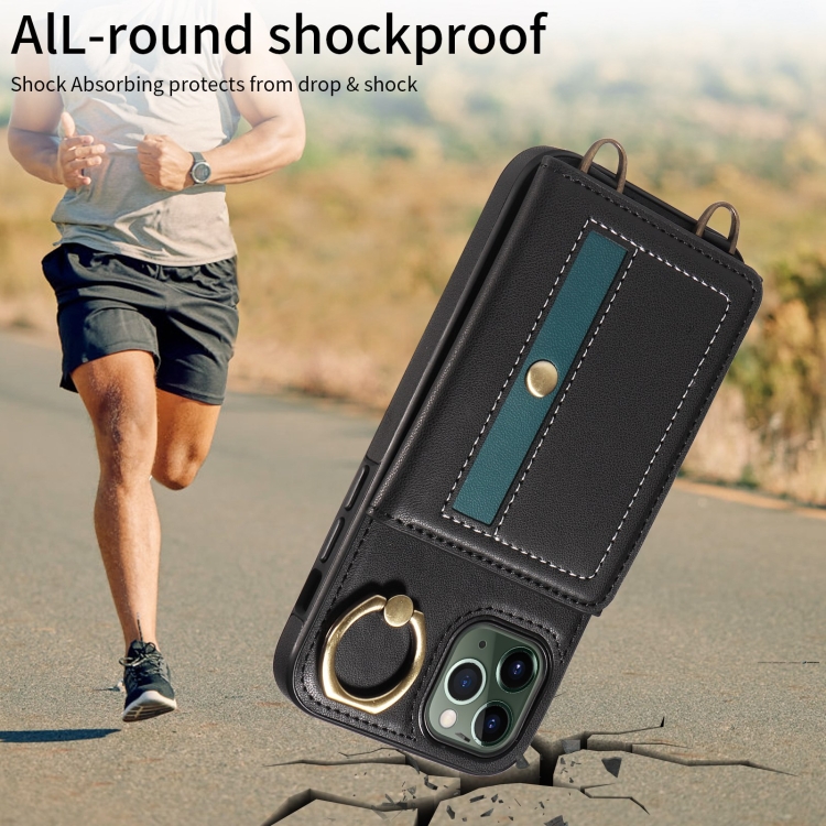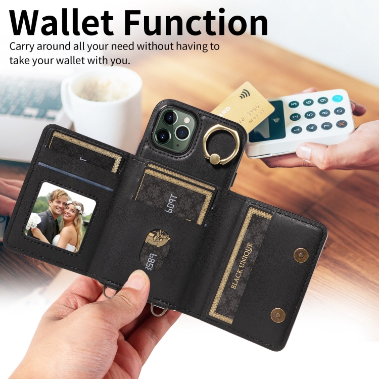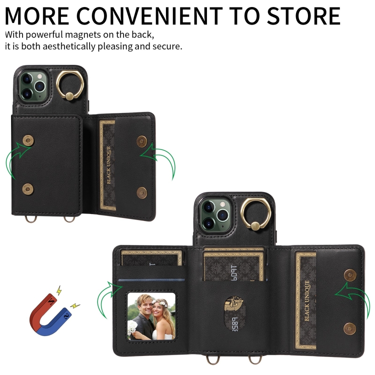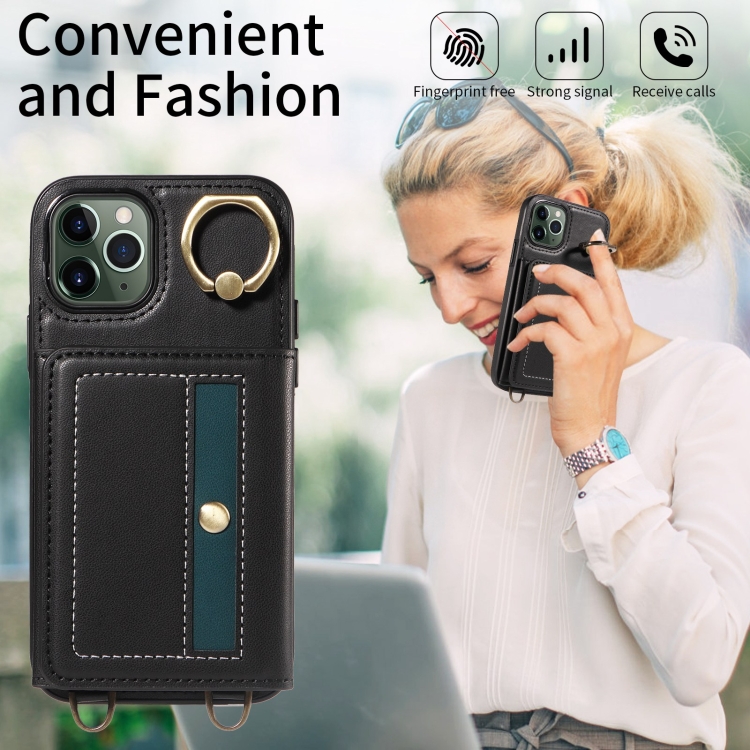 Funda para Teléfono iPhone 11 Pro Cuero Soporte Anillo Bolso Cruzado Tarjetas (Negro)