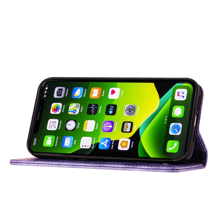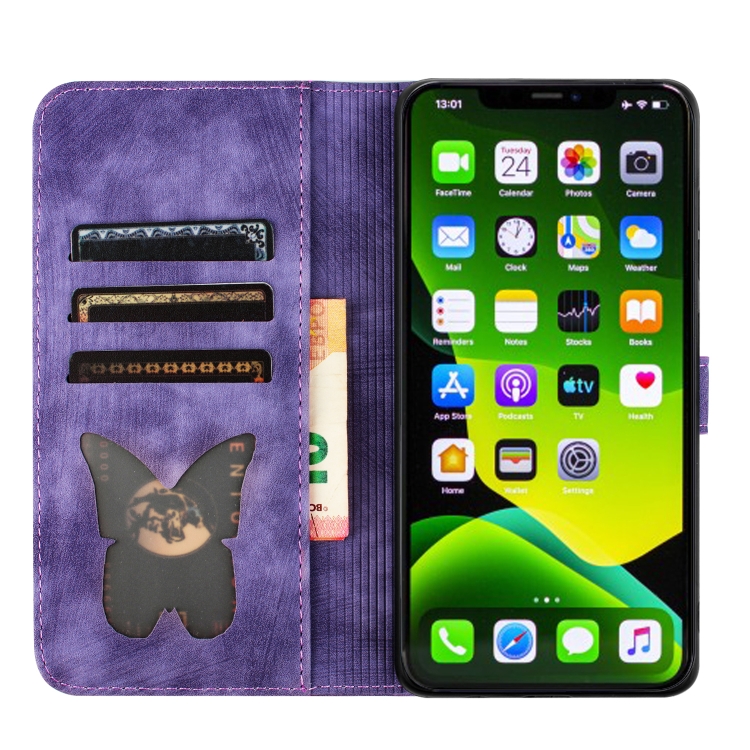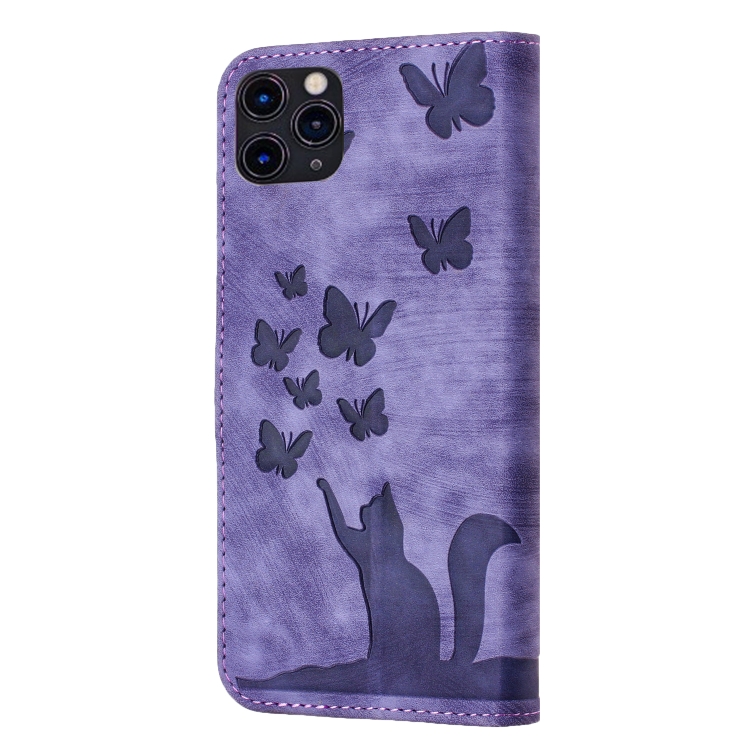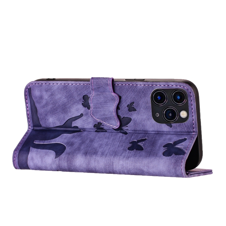 Funda de Teléfono iPhone 11 Pro Max Butterfly Cat Cuero con Tapa En Relieve (Púrpura)