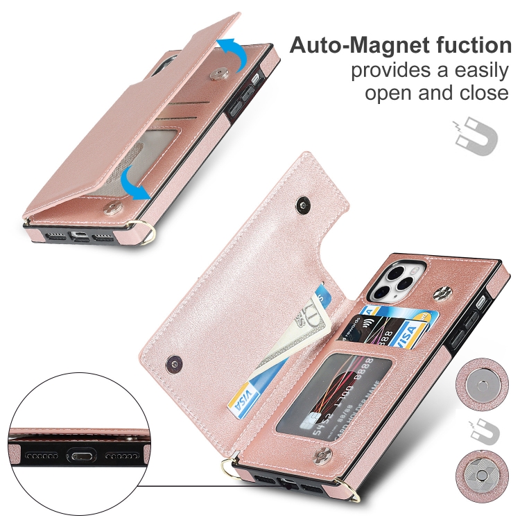 Funda para iPhone 11 Pro Max Cross-Body Square Doble Hebilla Flip Card Bag TPU + PU con Ranuras para Tarjetas, Billetera, Foto y Correa (Oro Rosa)