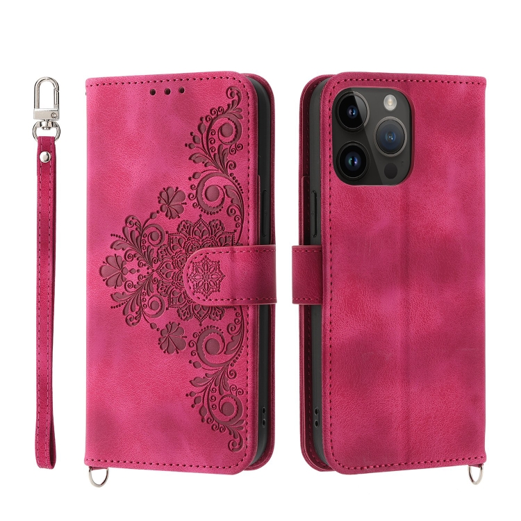 Funda para iPhone 11 Pro Skin-Feel Flowers Cuero con Billetera en Relieve (Rojo Vino)