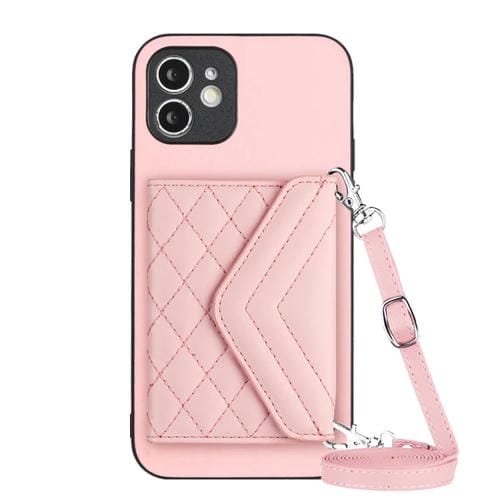 Estuche para Teléfono iPhone 12 con Bolsa para Tarjetas Rfid Textura Rómbica y Cordón Largo (Oro Rosa)