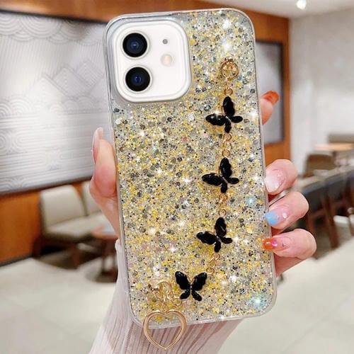Funda para Teléfono iPhone 12 TPU Epoxi con Cadena de Mariposa y Lentejuelas Estrelladas (Amarillo)