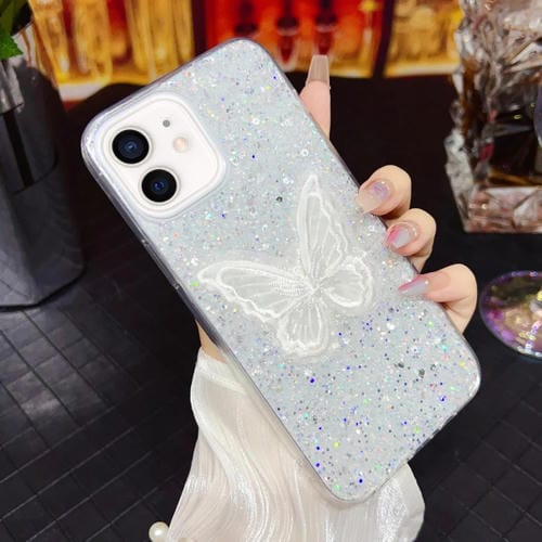 Funda para Teléfono TPU Epoxi iPhone 12 Mariposa Bordada con Lentejuelas Estrelladas (Plateado)