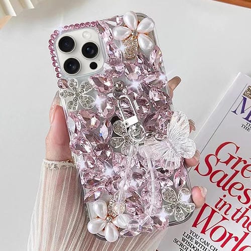 Funda para iPhone 12 Pro PC con Incrustaciones de Diamantes de Mariposa Hecha a Mano (Rosa)