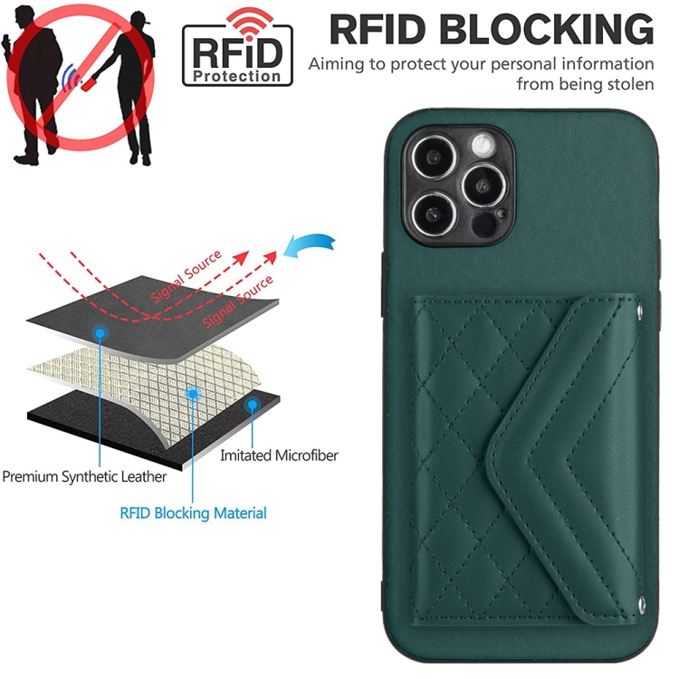 Estuche para Teléfono iPhone 12 Pro Rfid con Bolsa para Tarjetas Textura Rómbica y Cordón Largo (Verde)