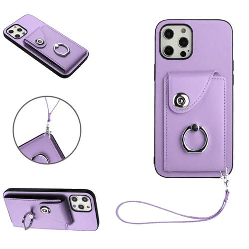Funda para Teléfono iPhone 12 Pro de PU con Soporte para Anillo y Bolsa para Tarjeta con Cordón (Púrpura)