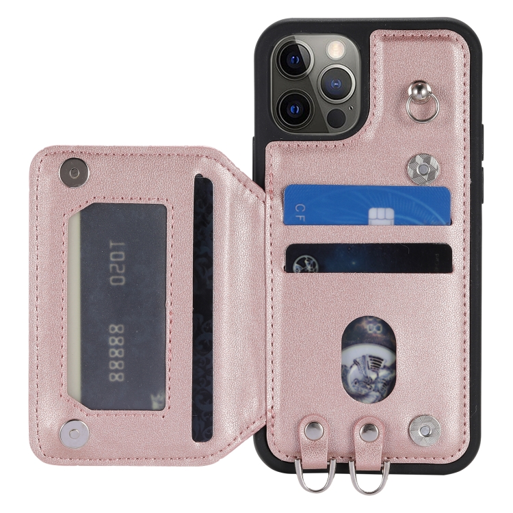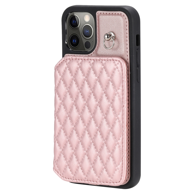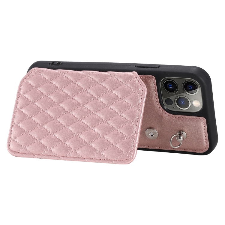Funda para Teléfono iPhone 12 Pro Max Bolsa para Tarjetas Textura de Rejilla Cordón (Oro Rosa)
