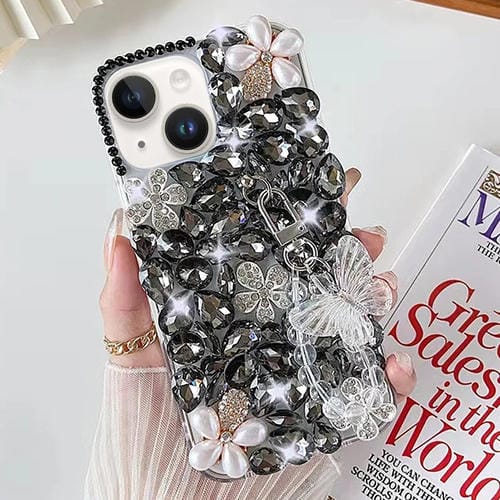 Funda para Teléfono iPhone 13 con Incrustaciones de Diamantes y Mariposas Hecha a Mano (Negro)