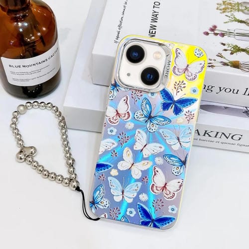 Funda para Teléfono iPhone 13 con Mariposa Láser Galvanizada y Correa para Muñeca (Azul)