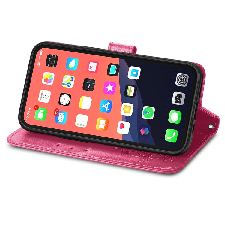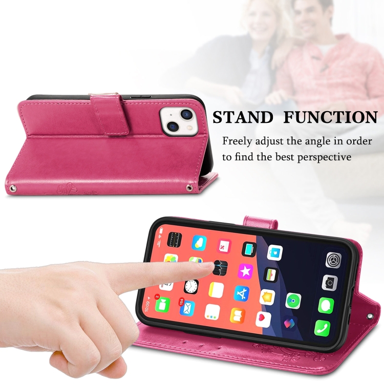 Funda de Cuero para iPhone 13 Mini Cierre Trébol de Cuatro Hojas Hebilla En Relieve Protección con Cordón Ranura para Tarjeta Monedero Soporte (Magenta)