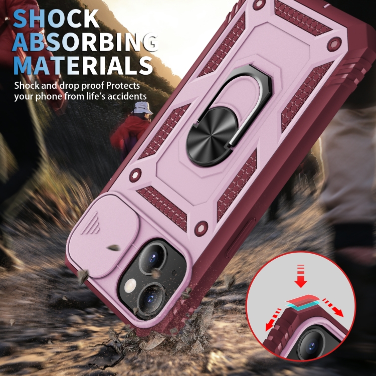 Funda protectora para iPhone 13 Mini TPU + PC con cubierta de cámara deslizante soporte giratorio 360 ranura para tarjeta (Rosa + Rojo Oscuro)
