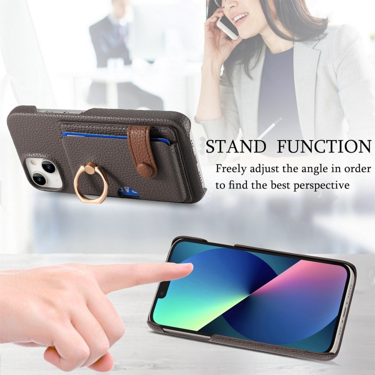Funda para Teléfono iPhone 13 Mini Borde de Aceite Cuero Litchi con Anillo y Tarjeta (Gris)