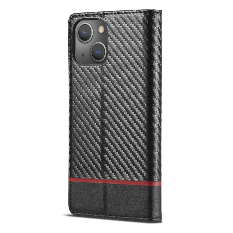 Funda para iPhone 13 Mini Lc.Imeeke Cuero con Tapa Horizontal Fibra de Carbono PU + TPU Soporte Ranura Tarjeta Billetera (Negro Horizontal)