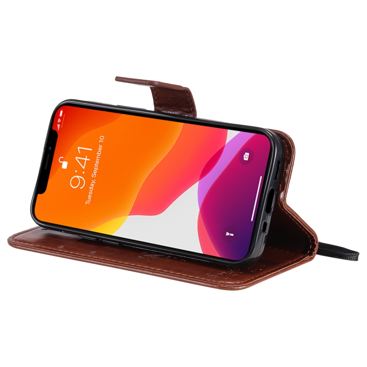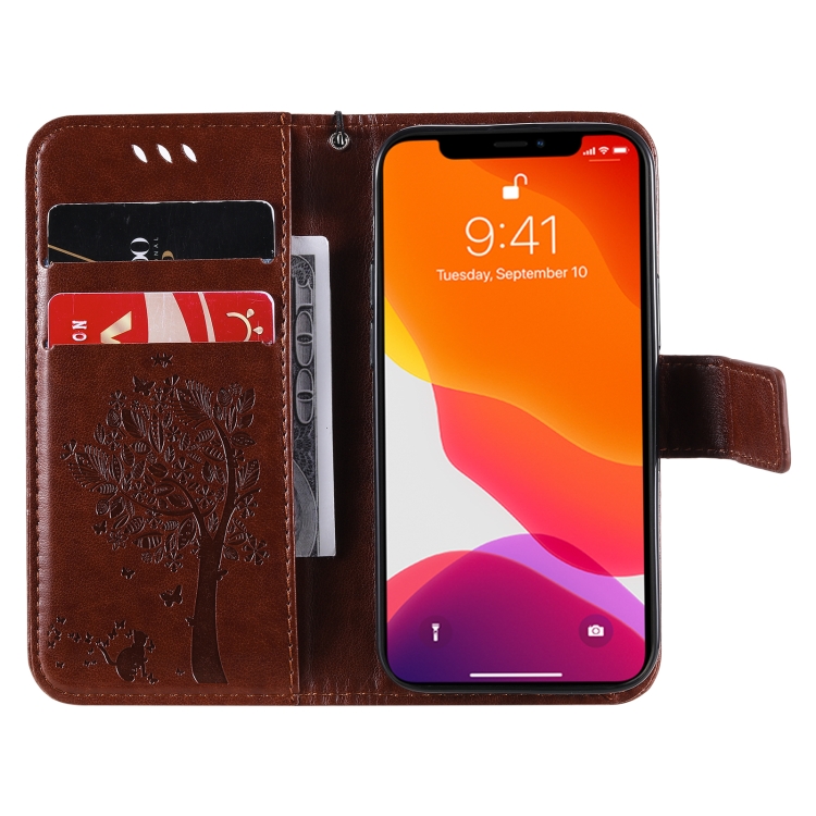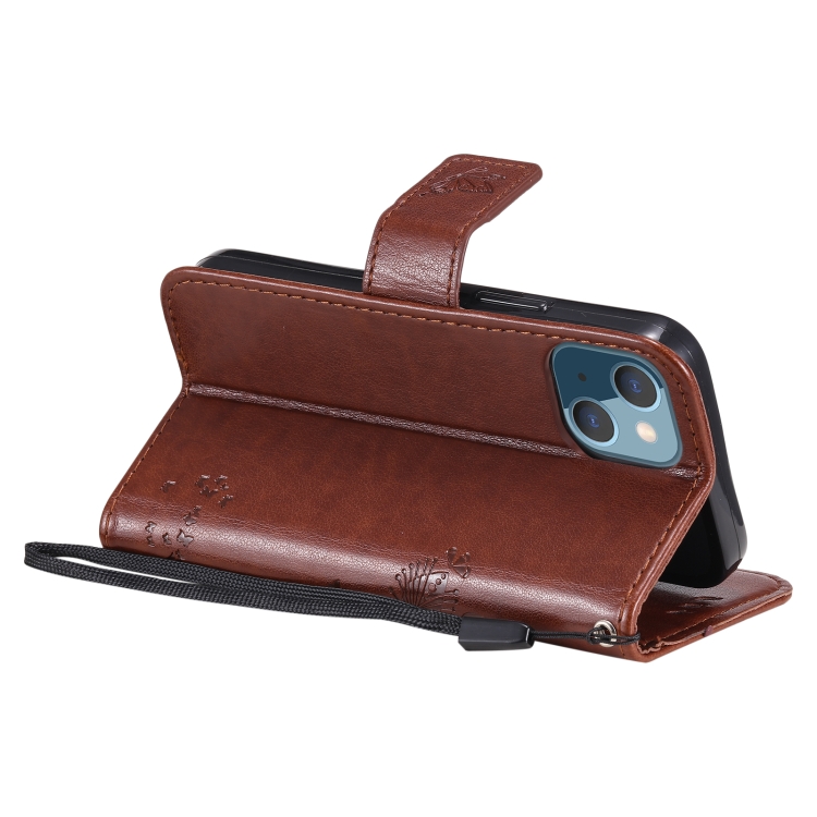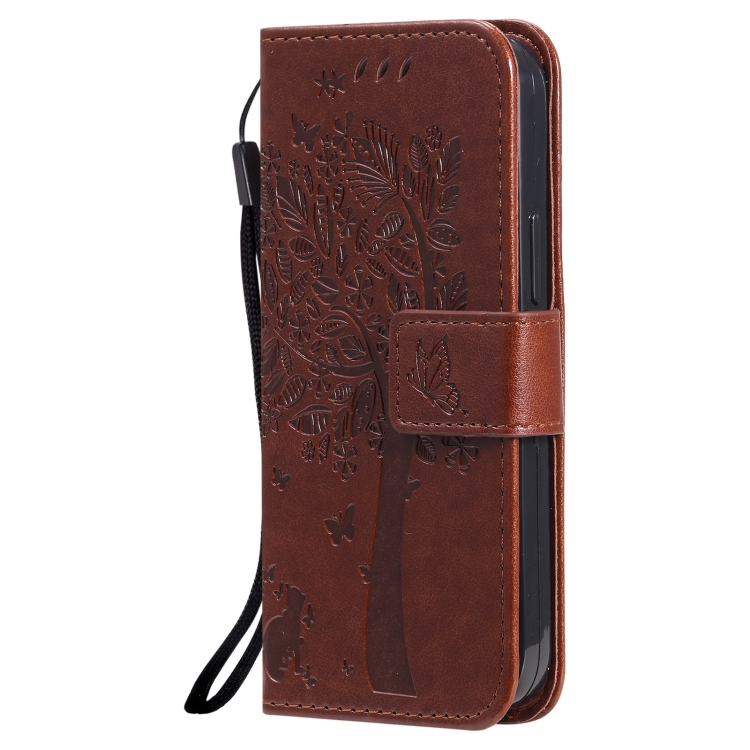 Funda para iPhone 13 Mini Cuero de PU Patrón Árbol y Gato Tapa Horizontal Soporte Ranuras Tarjetas Billetera Cordón (Marrón)