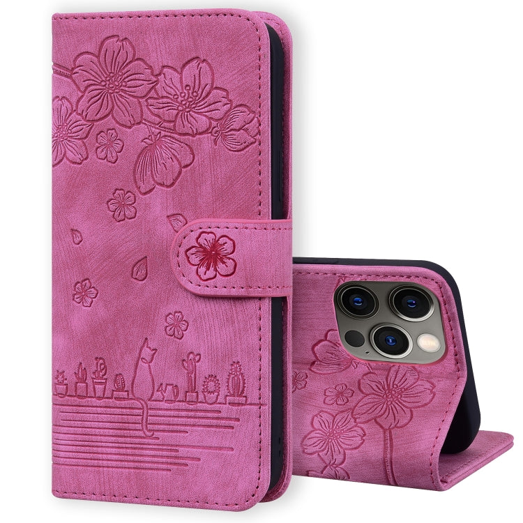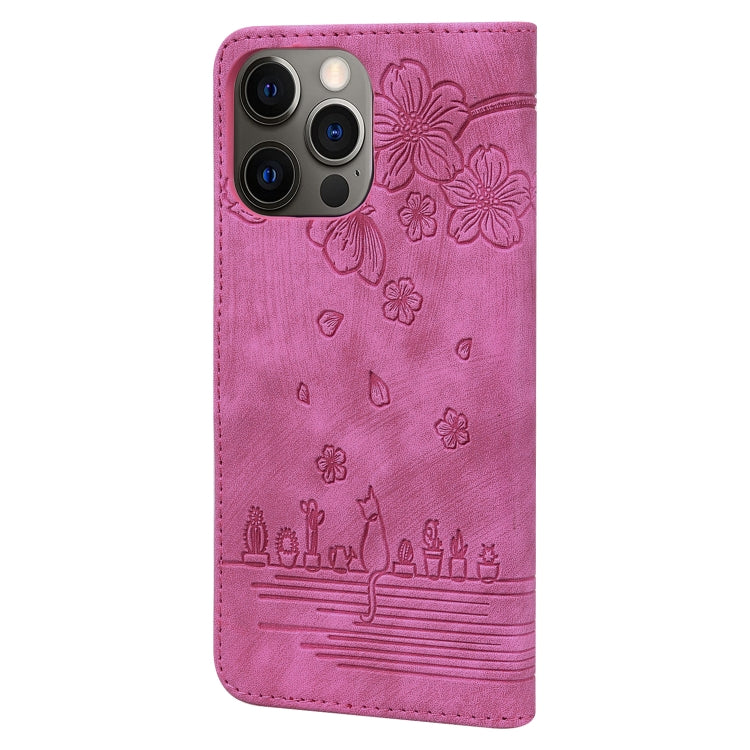 Estuche de Cuero para iPhone 13 Pro Cartoon Sakura Cat En Relieve (Rose Red)