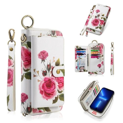 Funda para iPhone 13 Pro Max Pola Magsafe Flower Cuero con Billetera y Cremallera Multifuncional (Beige)