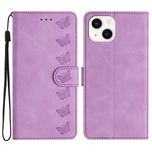 Funda para iPhone 13 Seven Butterflies Caja de Cuero En Relieve (Púrpura)
