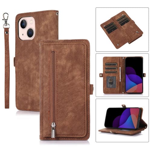 Funda de Cuero iPhone 14 Cremallera Ranura para Tarjeta Hebilla Monedero (Marrón)