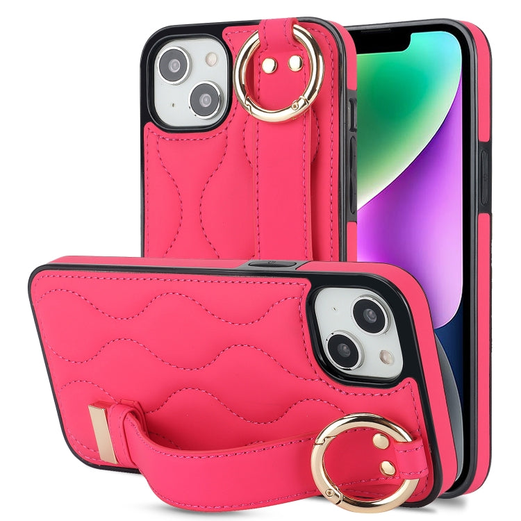 Funda para teléfono iPhone 14 antideslizante con anillo cobertura completa PU con muñequera (Rosa Roja)