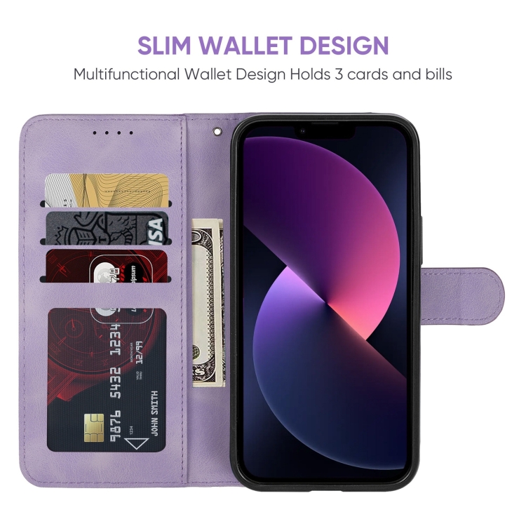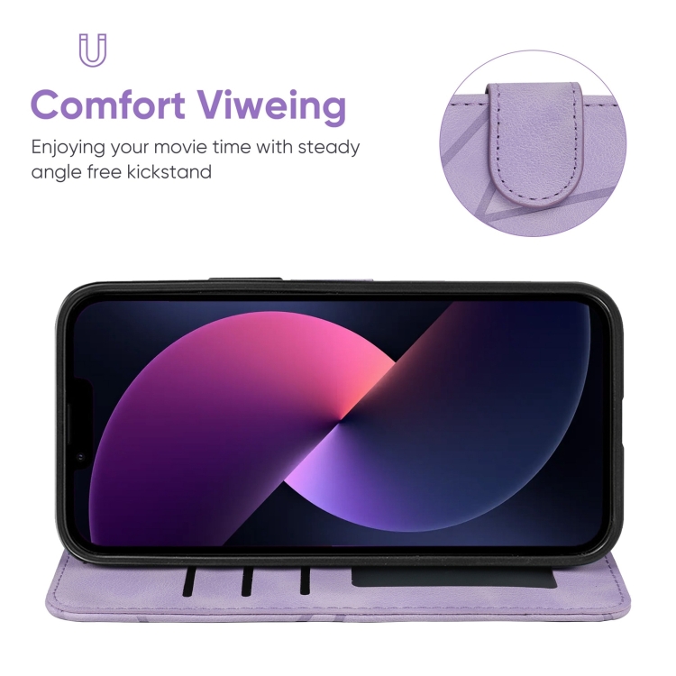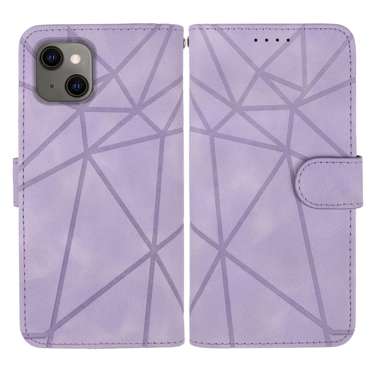Funda para teléfono iPhone 14 Plus Skin Feel cuero con líneas geométricas (Púrpura)