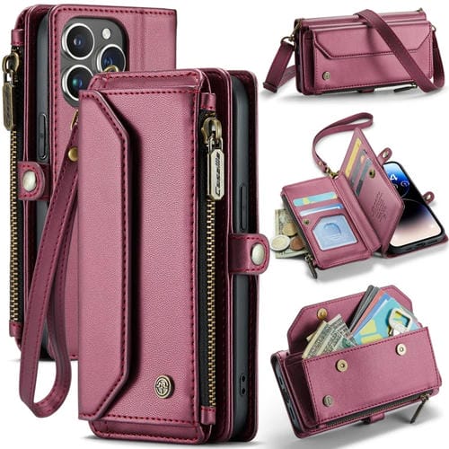 Estuche para iPhone 14 Pro Caseme C36 Cartera con Ranuras para Tarjetas Cremallera Antirrobo Rfid (Rojo Vino)