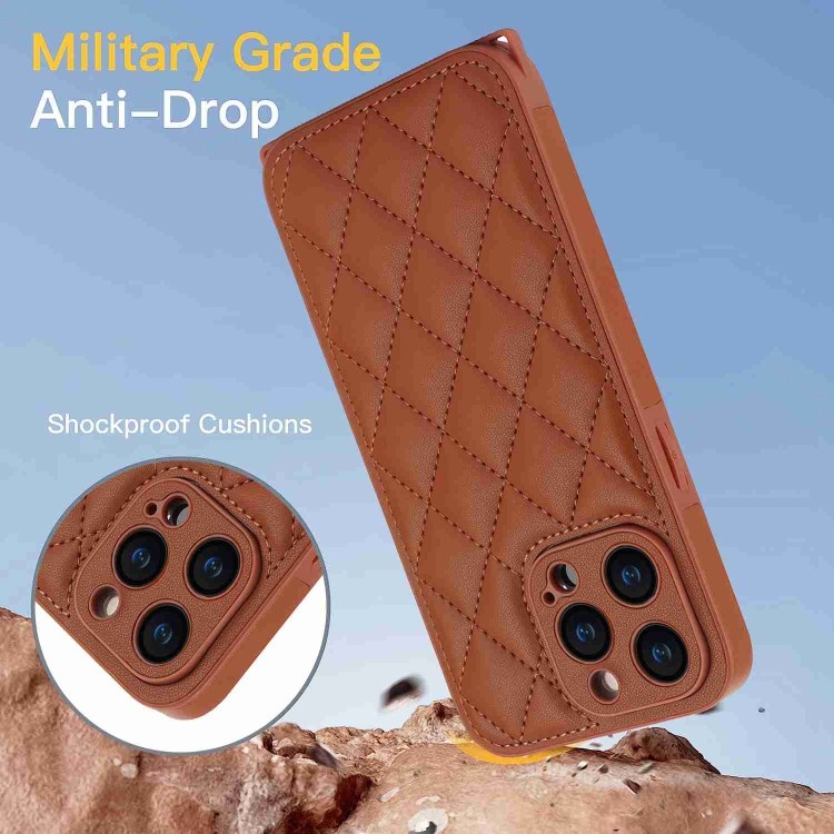 Estuche para Teléfono iPhone 14 Pro Max Textura Rómbica con Cordón Doble (Marrón)